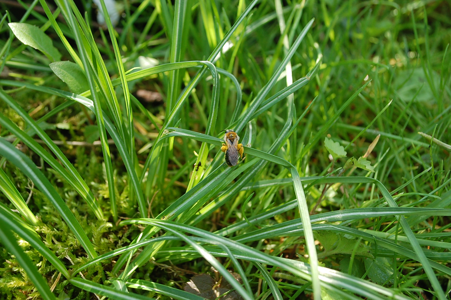 Und dann bin ich auch noch, dank Sensibilisierung durch den Vortrag über eine Wildbiene gestoplert. Hier sieht man eine Frühlings-Seidenbiene, ziemlich schwer mit Pollen beladen. Sie turnte unbeholfen am Grashalm und schaffte es gar nicht abzuheben. Ich musste natürlich erst mal recherchieren, was ich da habe.
