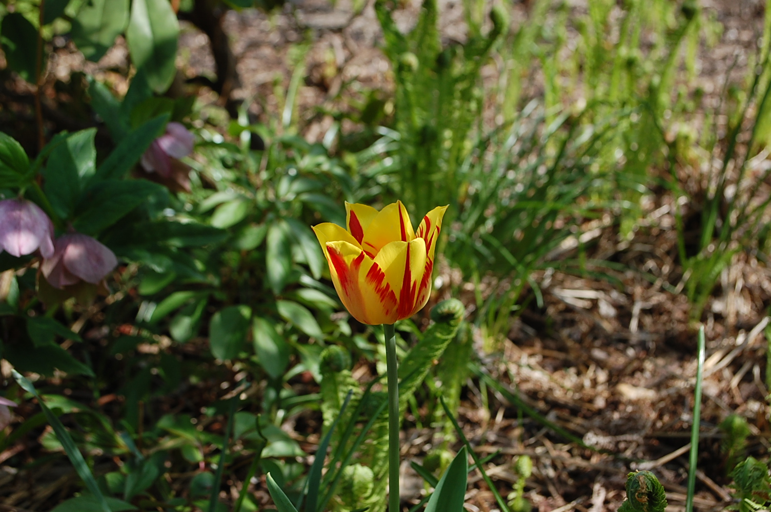 Letztes Jahr habe ich einen Topf hohe, prächtige, Schachbrettblumen bekommen. Der Kampf gegen den Giersch hat sie enorm schrumpfen lassen. Sie guckt nur knapp aus der Konkurrenz hervor. Meine gekauften Tulpen aus den Vorjahren nerven mich mit ihrer Divenhaftigkeit. Sie Treiben gleich nach dem ersten Jahr nur noch Blätter und wollen nicht blühen. Einzig durchsetztungsfähig über viele Jahre sind die Roten und Gelben, die schon vor mir in diesem Garten waren. Diese rot-gelbe Tulpe hat es aber das erste Jahr bis zur Blühte geschafft.