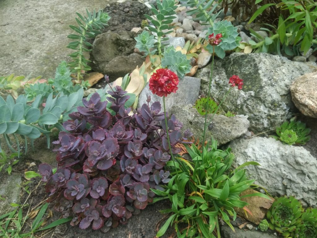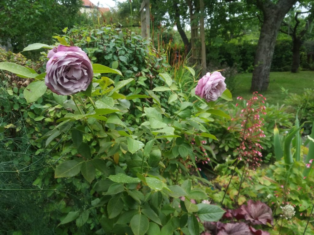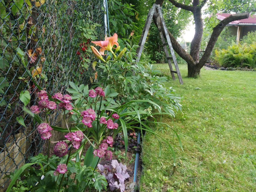 Mit dieser Stelle in der Rand-Rabbatte habe ich immer noch Probleme. Ich doktere immer noch an der richtigen Bepflanzung herum. Nicht, dass es mir an Ideen und Pflanzenkombination fehlen würde, aber es funktioniert einfach nicht. Ich pflanze etwas, aber es entwickelt sich nicht richtig. Den Taglilien ist es für 2 der 4 gepflanzten Sorten zu wenig Licht. Die Sterndolden wuchsen rückwärts und stagnieren auf einem Level, dass ich als dahin vegetieren bezeichnen würde- ihnen ist der Boden nicht frisch genug. Die Purpurglöckchen entwickeln sich sehr langsam, nachdem sie zunächst auch erst mal weg schrumpften. Ich habe deshalb wieder nachjustiert und was umgesetzt und in die Lücke eine dunkle Sterndolde gepflanzt und ein rotes Lampenputzer-Gras (Pennisetum setaceum ‘Rubrum’). Das kann aber langfristig nicht bleiben, es ist nicht der richtige Standort. Da wo es eigentlich geplant war, sah es aber nicht stimmig aus.