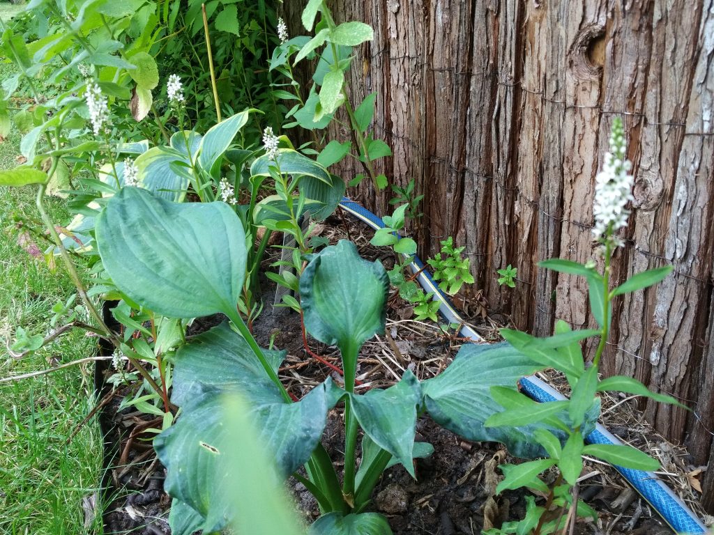 Ich habe noch mal bei den Funkien zugeschlagen. Ich finde sie einfach wunderschön. Dieses satte üppige Grün macht sich einfach gut im Schatten. Ich mag ihre großen, dicken Blätter. Die hellen Flecken und Blattränder bringen Licht ins Dunkel. Funkien mit harten Kontrasten (weiß/ grün) mag ich aber nicht.