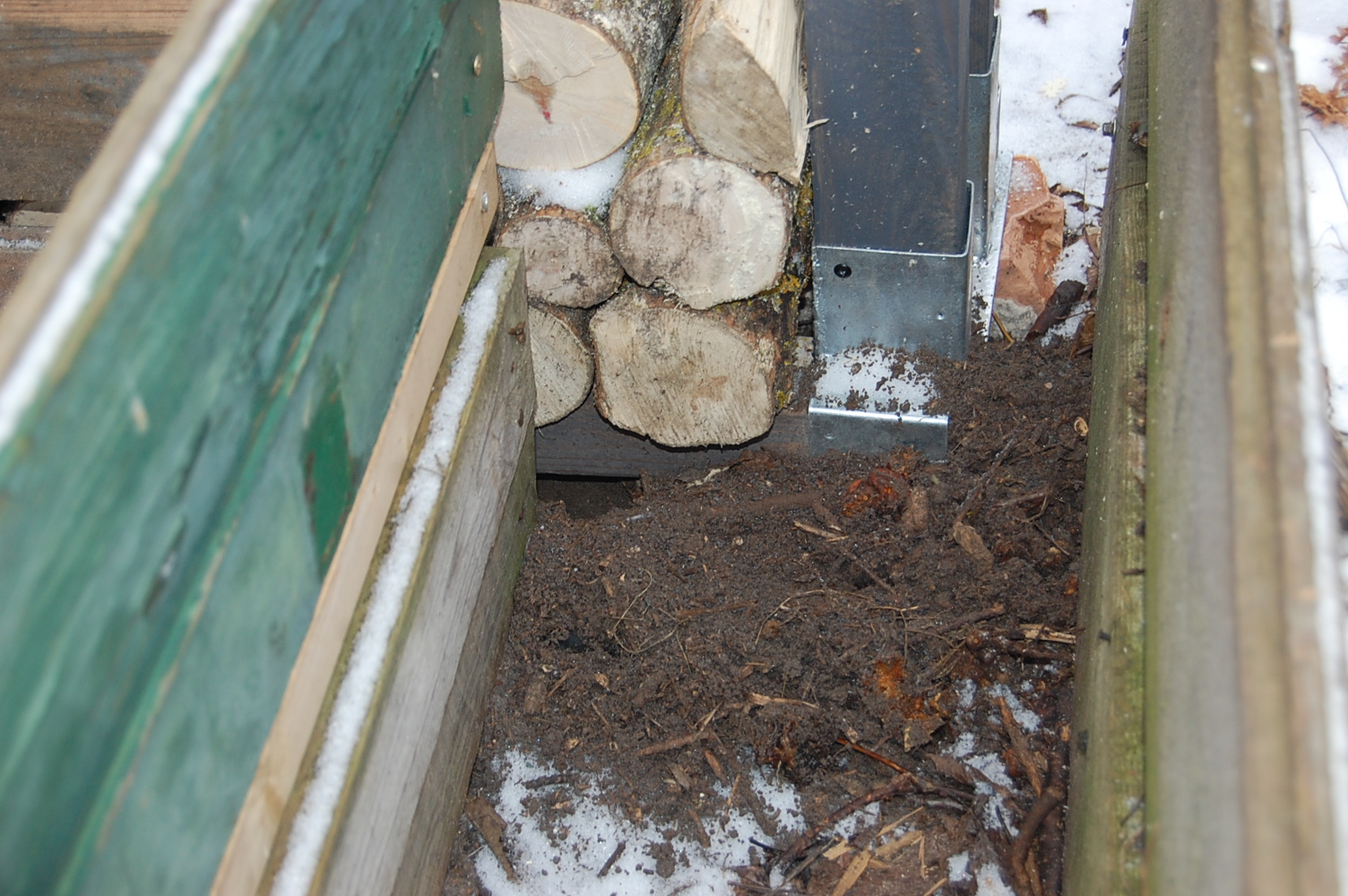 Es sieht so aus, als hätte sich ein Schutz suchendes Tier einen Eingang unter das Holzregal gegraben. Die Erde ist frisch aufgeworfen. Aber welches Nagetier ist denn jetzt noch so aktiv? Ich würde ja so gerne wissen was das ist, so lange ist keine Ratte ist bin ich fein damit. Ich habe mir ja gewünscht, dass dies ein Lebensraum für Tiere sein soll und so schnell wurde dieser Wunsch erfüllt. Ich freue mich. Ein paar Tage später kam noch ein Loch dazu: Sieht aber schon ein bisschen nach Ratte aus, denn es ist ganz schön groß:-/