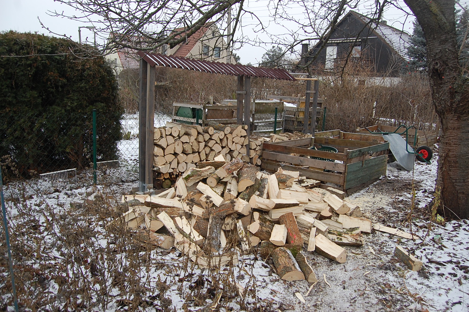 Ich hatte Zeit mir Gedanken zu machen und ein paar Tage später gings weiter. Ich dachte ich könnte das bisschen fehlende Holz selbst zusammenkratzen. Ich habe am Flieder etwas Pflegeschnitt betrieben und alte Stummel entfernt, die bei unfachmännischen Verstümmelungsrückschnitten meiner Vorgänger stehen gelassen wurden. Der Forstfritze versteht wohl auch was vom Obstbaumschnitt usw. Er hat mir einiges zu meinen Bäumen erzählt und mir Ratschläge gegeben, die ich dankbar entgegen nahm. Auch zu diesen Stummeln, der Nichtversorgung dieser Stummel, wenn dort kein Ast mit Blattwerk abgeht und von der chemischen Abtrennung un- oder unterversorgter Äste und er zeigte mir eine solche Stelle an meinem Holsteiner-Cox-Apfelbaum. Er meinte auch, dass etwas mit der Rinde des Baumes nicht in Ordnung sei und das dies darauf hindeute, dass ihm dieser Radikalschnitt, der ihm vor meiner Übernahme verpasst wurde, überhaupt nicht gut getan hätte. Ich bin ja immer noch damit beschäftigt diese Massen an Wasserschossern zu reduzieren.